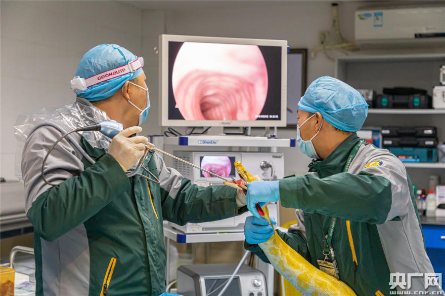 獸醫張天佑利用內窺鏡對黃金蟒的氣管進行檢查(央廣網發 通訊員供圖)