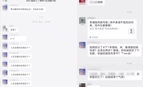 在網(wǎng)傳的視頻中,侮辱性字眼多次出現(xiàn)。據(jù)了解,該教師在班級群里也曾發(fā)過侮辱性文字。