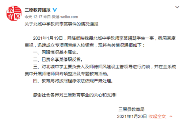三原縣教育局官微通報顯示:2021年1月19日,網(wǎng)絡(luò)反映我縣北城中學教師李某謾罵學生一事,我局高度重視,迅速成立專項調(diào)查組入校調(diào)查,現(xiàn)將有關(guān)情況通報如下:一、網(wǎng)曝情況基本屬實。二、已責令李某停職反省。三、對北城中學主要負責人及師德師風建設(shè)主管領(lǐng)導進行約談,并在全系統(tǒng)集中開展師德師風專項整治及專題教育活動;四、教育局將按照程序依法依規(guī)嚴肅處理。