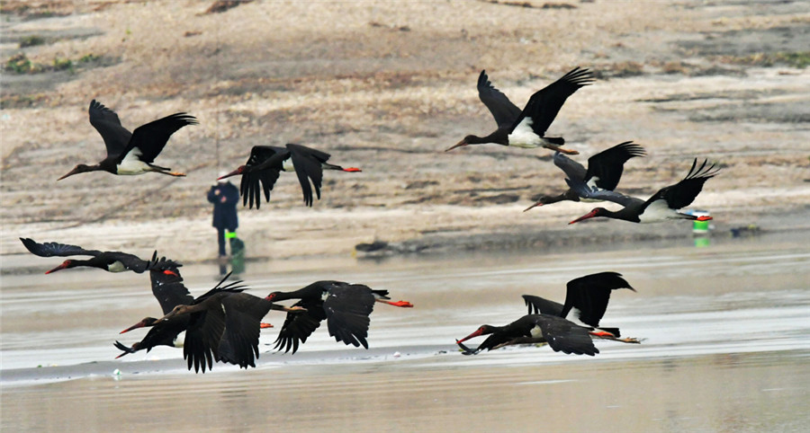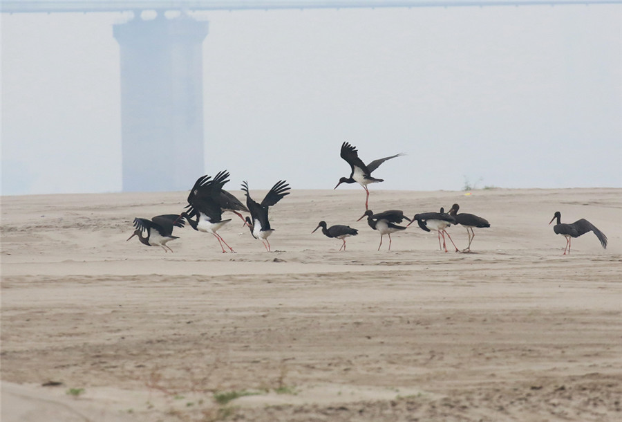 黑鸛種群在武漢天興洲越冬棲息(央廣網發 武漢市觀鳥協會供圖)