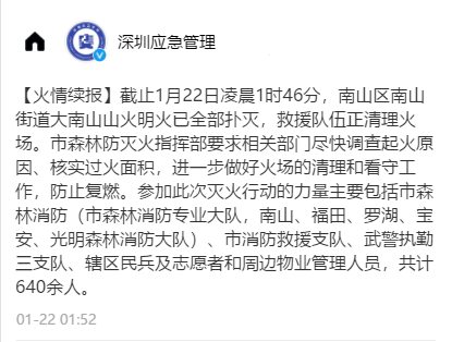 1月22日凌晨1時46分,現場明火全部撲滅,無人員傷亡情況。救援人員正有序清理火場,3支隊伍及救援車輛看守火場,防止復燃。此次山火主要燃燒物為灌木、桉樹和雜草。相關部門正在調查起火原因、核實過火面積。本次增援共投入市、區森林消防隊伍(市大隊,南山、福田、羅湖、寶安、光明)110人,市消防救援支隊134人,武警執勤三支隊136人,轄區民兵150人,志愿者和大南山公園工作人員110人,共計約640人。