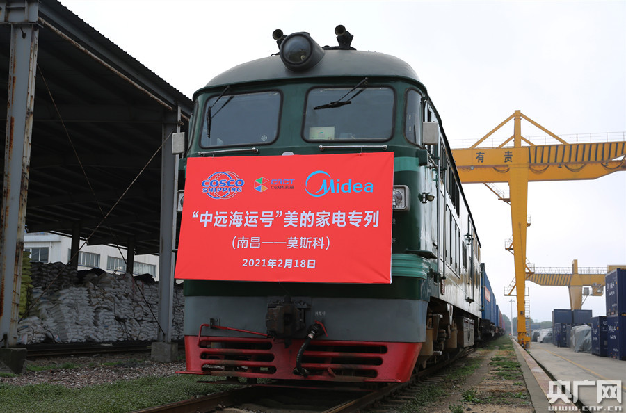 央廣網南昌2月18日消息(記者謝元森 通訊員李翔 周娜)2月18日,滿載50車洗衣機、洗碗機等電器的中歐班列專列由南昌(向塘)國際陸港橫崗站駛出,預計15天后抵達俄羅斯莫斯科。這也是江西省開行中歐班列以來,首次為家電企業開行的出口專列,班列貨價約148萬美元。