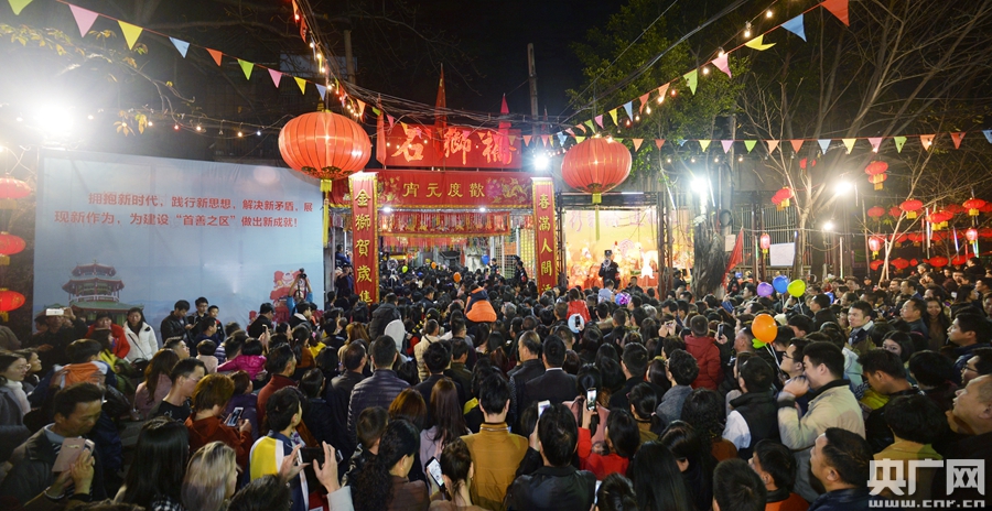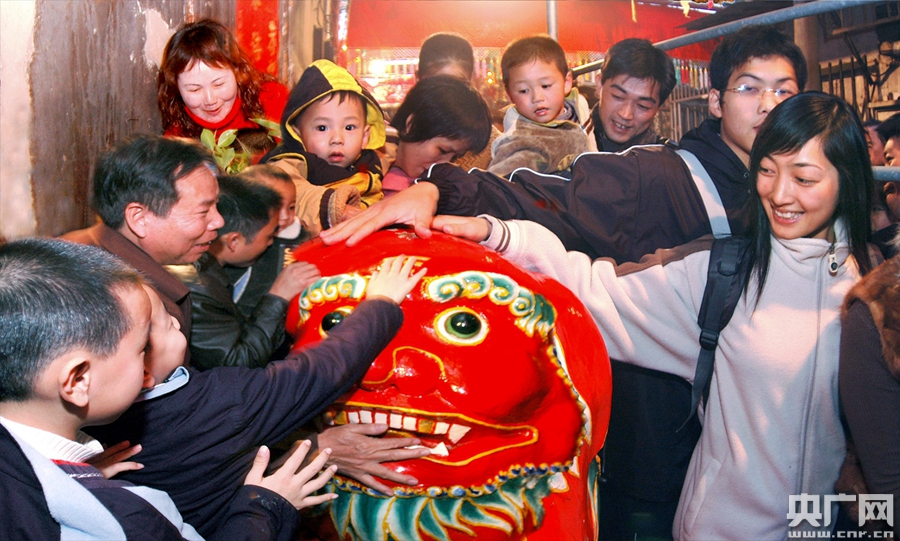 △資料圖。位于榕城打銅街的石獅橋是每年最熱鬧的地方,人們將此橋圍個水泄不通,大家一邊行橋一邊摸著橋頭的石獅,默念佳句,祈望能夠過個豐收、吉祥、安康的牛年。(央廣網(wǎng)發(fā) 涂英鵬 攝)
