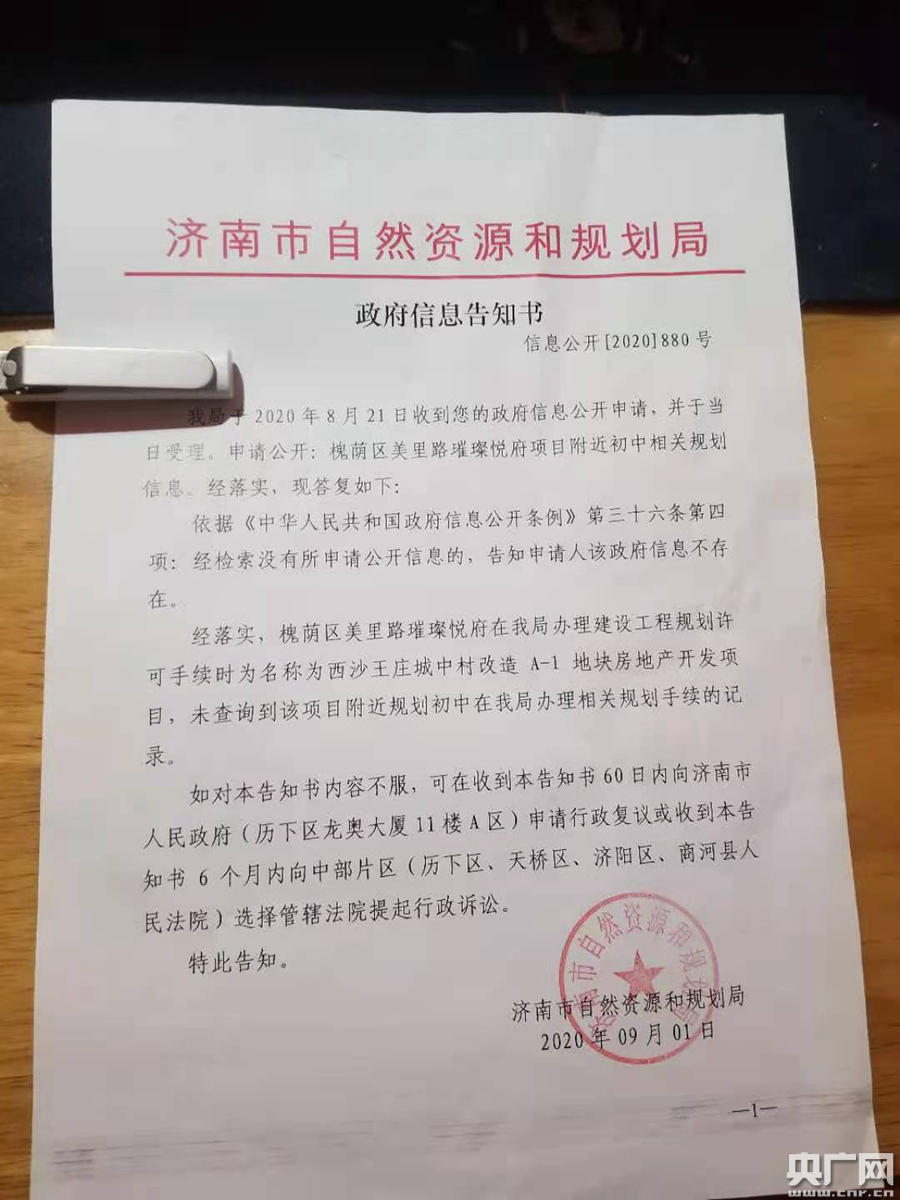 魏女士介紹,2020年9月1日,業主們向濟南市自然資源和規劃局提交的“槐蔭區美里路璀璨悅府項目附近初中相關規劃信息”政府信息公開申請得到了回復。文件中顯示,“經落實,槐蔭區美里路璀璨悅府在我局辦理建設工程規劃許可手續時名稱為西沙王莊城中村改造A-1地塊房地產開發項目,未查詢到該項目附近規劃初中在我局辦理相關規劃手續的記錄。”
