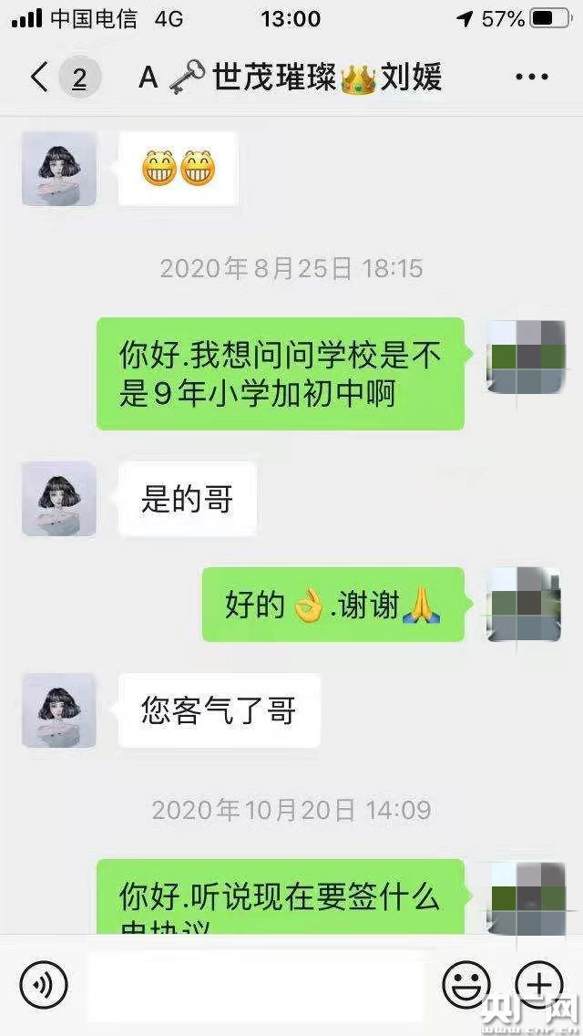 業主提供的聊天截圖中,售樓處工作人員承諾該小區有配套初中。(央廣網發 業主供圖)