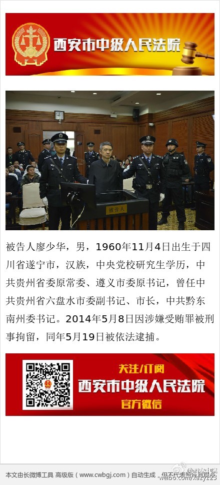 2014年12月17日,廖少華涉嫌受賄、濫用職權一案,經最高人民檢察院指定,由陜西省人民檢察院偵查終結后移送陜西省西安市人民檢察院審查起訴。