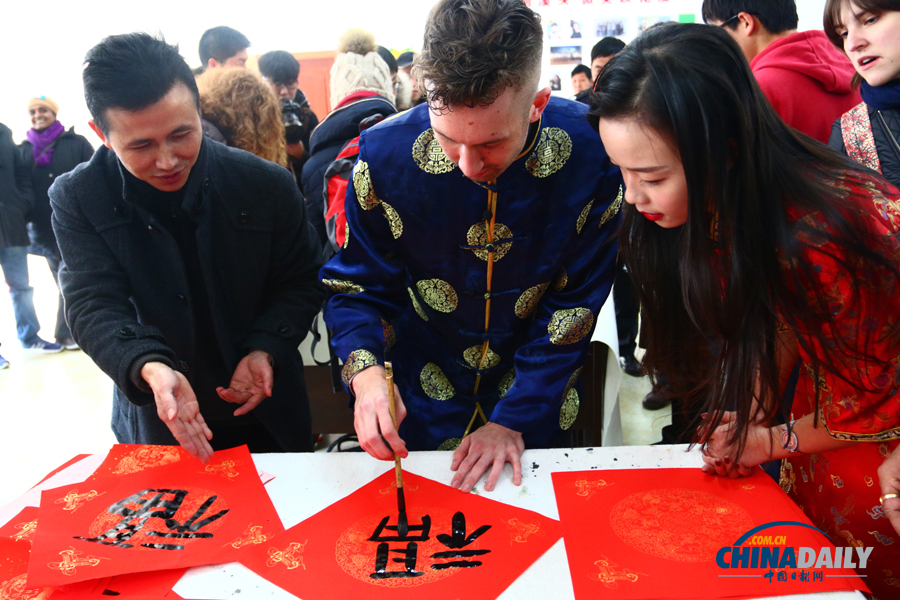 “春鬧三羊開景泰,花紅四海浴天香。”歡樂春節(jié)活動(dòng)現(xiàn)場(chǎng),冰島女士Arna潑墨揮毫,寫下了這幅春聯(lián),表達(dá)了外籍人士對(duì)中國(guó)羊年的美好祝福。