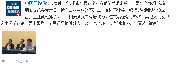 【李河君:企業家被紀委帶走后,公司怎么辦?】我有朋友被紀委帶走后,所有公司材料送不進去,合同不讓簽,銀行貸款到期也沒法簽,企業就死掉了。當年國美黃光裕有影響力,進去后還有點辦法。其他人就沒那么幸運了。企業家出事后,畢竟還只是嫌疑人,公司怎么辦,應有明確立法。(記者 謝愚)