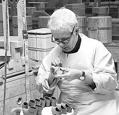 在荷蘭代爾夫特藍陶工廠,一名生產工人正在給著名的代爾夫特陶塑形。