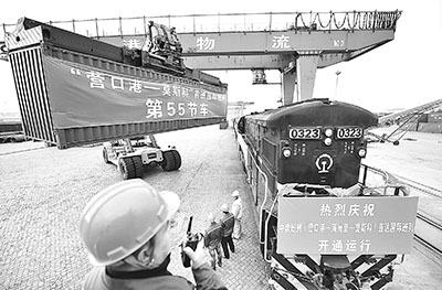 2014年10月18日,國內第一個經滿洲里口岸過境直達莫斯科的國際集裝箱班列,在遼寧營口港裝完55節車皮之后徐徐開出。