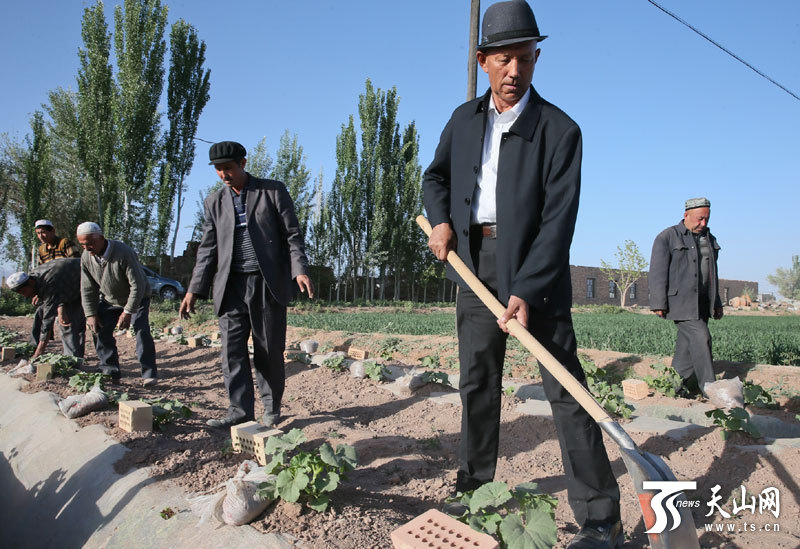 則克爾認(rèn)真看了種子的發(fā)育情況后,帶著一些農(nóng)民又沿著田埂除草、翻土。6月就要瓜熟蒂落了,則克爾期待著豐收的日子。他說:“到時(shí)候我會連穿鞋子的時(shí)間都沒有呢。”