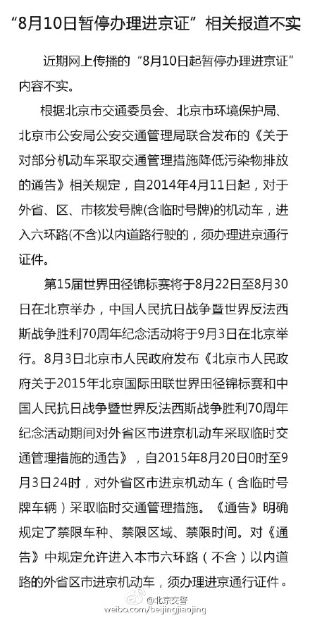 中新網8月5日電據北京市公安局公安交通管理局官方微博,近期網上傳播的“8月10日起暫停辦理進京證”內容不實。