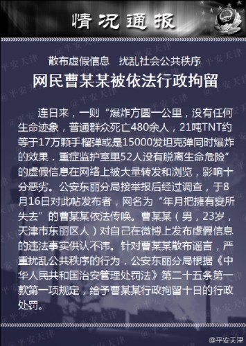 中新網8月17日電 據天津市公安局官方微博消息,近日一則“爆炸方圓1公里,沒有任何生命跡象,普通群眾死亡480余人”的虛假消息在網上大量流傳。經調查,天津警方傳喚了網民曹某某(男,23歲,天津東麗區人),其對在微博上散布虛假信息供認不諱,警方決定將曹某某依法行政拘留十日。