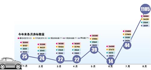 該人士分析,“不過,這次因為最低成交價和最高成交價相差這么大而棄標的人已經算比較多了,畢竟8月的平均價不是最高的。”不少市民認為9月競價的個人牌相對要多些,而且有了萬元底價成交的歷史,判斷9月車牌競價可能回落。但該人士分析,這也可能帶來另一種結果,即參與9月個人車牌競價的人會更多。另外,接近年底,市民購車欲望相對強烈,9月個人牌最終成交價也極有可能逆勢而上。