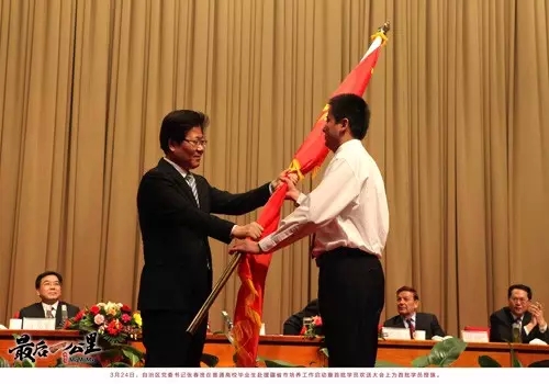 2011年3月24日,張春賢在普通高校畢業(yè)生赴援疆省市培養(yǎng)工作啟動(dòng)大會(huì)上為首屆學(xué)員授旗