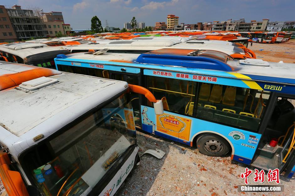 2015年9月17日,廣州市白云區(qū)鐘落潭鎮(zhèn)市郊,數(shù)百輛公交車密密麻麻的擠放在一塊廣闊的空地上。據(jù)附近村民介紹,近年來(lái)這里的公交車越積越多,這些公交車大多數(shù)都是事故車,有的車從外觀上看還屬于輕微事故,不知何故沒(méi)有送去維修再使用卻在這個(gè)露天場(chǎng)日復(fù)一日的經(jīng)受日曬雨淋,整個(gè)停車場(chǎng)沒(méi)有安保之類的保護(hù)措施,閑人很容易就能進(jìn)入到車場(chǎng)內(nèi),一些公交車車門敞開(kāi),有的車內(nèi)零件被七零八落的擺放在車內(nèi)。中新社發(fā) 劉蛟 攝 圖片來(lái)源:CNSPHOTO