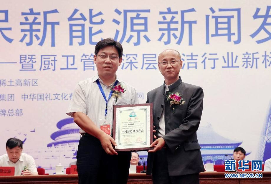 9月20日,廚衛管道深層清潔行業高峰論壇暨環保新能源創新品牌“一灌通”新聞發布會在京舉行。圖為環保證書頒發儀式。新華網發(王 超 攝)