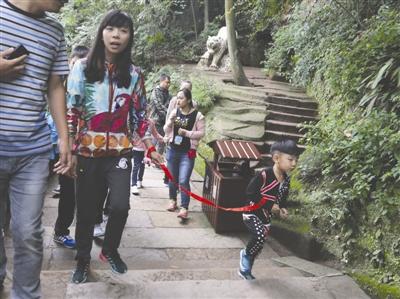 2015年10月1日四川樂山大佛景區。圖為來自寧夏的張女士在游覽樂山大佛景區時用紅絲帶綁著兒子的手以防人多走失。(記者 王紅強 )