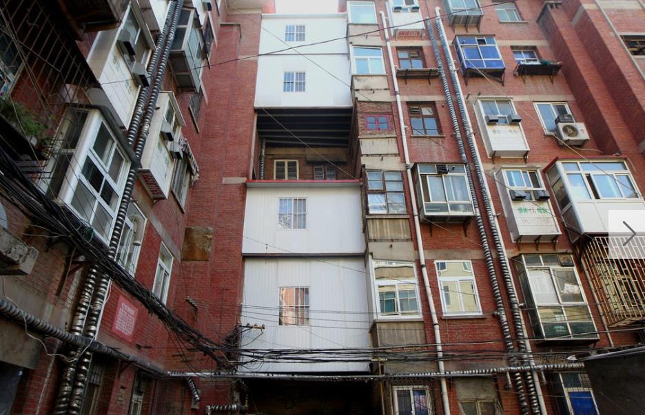 10月27日,河南省鄭州市崗杜街1號院內,一幢6層樓拐角處被人用鋼管和彩板在墻與墻之間搭建起了書層“懸空樓閣”。 圖片來源:東方IC