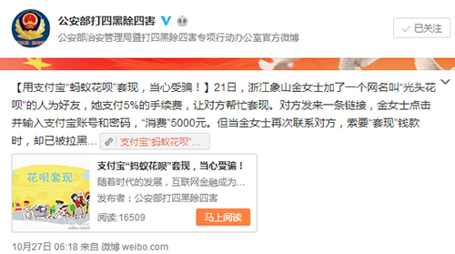 “螞蟻花唄”官方微博早在5月8日就發(fā)表聲明稱,將嚴打“套現(xiàn)”,違規(guī)商家將被封號或凍結(jié)賬戶資金。公安部打四黑除四害官微也在10月27日發(fā)布消息提醒網(wǎng)民,當(dāng)心受騙!