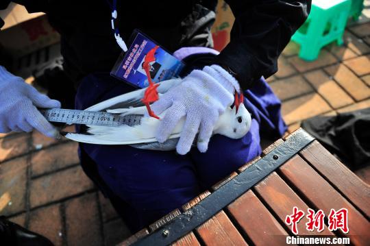中新網(wǎng)昆明12月10日電(馬騫 楊謹(jǐn)語)“成鳥,體重282克,體長38.2厘米,喙長31.38毫米……”將這些信息一一記錄之后,工作人員還會(huì)在紅嘴鷗的腳上套上一個(gè)金屬腳環(huán)和一個(gè)藍(lán)色塑料腳環(huán)。10日,工作人員在昆明海埂大壩上一番忙碌,紅嘴鷗們便有了自己的“身份證”。