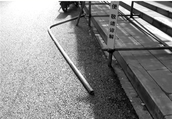 其實小葉是被橫臥在非機動車道上的一根鋼管絆倒了。昨天中午,錢報記者在事發(fā)現(xiàn)場找到了那根鋼管。被電動車撞到的鋼管已經(jīng)折成90度,而一旁綠化帶欄桿上也有明顯的碰撞痕跡。