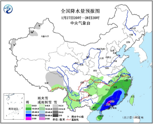 27日20時至28日20時,新疆西部、西藏東部等地的部分地區有小到中雪或雨夾雪;江南中東部、華南中東部等地有中到大雨,其中,江西南部、福建西部、廣東等地的部分地區有暴雨,局地有大暴雨(100~120毫米)。黃海南部、南海東北部和東南部、東海大部海域將有6~7級、陣風8級風。