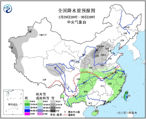 29日20時至30日20時,新疆西部、西藏西北部和東北部、青海南部、西北地區東部、華北大部、江漢北部、黃淮西部等地有小到中雪或雨夾雪,局地有大雪;西南地區東部、云南南部、江淮南部、江南東部、廣東東部、海南、臺灣等地的部分地區有小到中雨,局地大雨。山東半島、遼東半島等地有4~6級風。