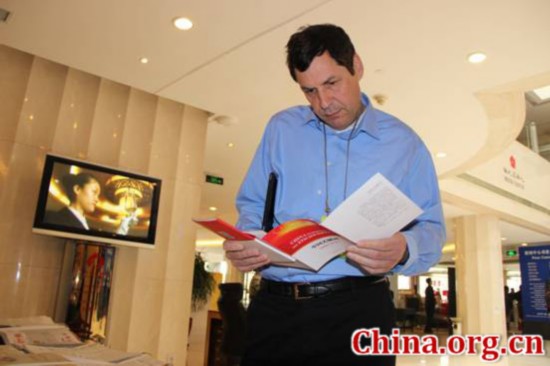 美國彭博新聞社記者馬克·邁爾尼克認真翻閱《中國關(guān)鍵詞》。[中國網(wǎng) 吳瓊靜 攝]