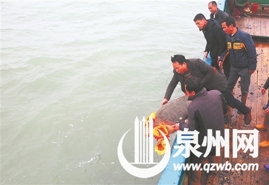 昨日下午3點多,記者隨同李阿尾、惠安縣海洋與漁業局工作人員搭上小泡沫船,再轉乘大漁船離開前峰碼頭。下午3點50分,一行人將海龜抱起,放回大海。惠安縣海洋與漁業局漁政股負責人梁偉斌說,在當地一帶海域捕到如此大的“太平洋麗龜”,較為少見。他提醒,漁民誤捕海龜應立即將它放回大海,如果對龜的種類不明確,應及時通知海洋與漁業等部門前來處理。
