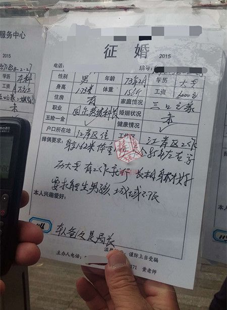 今日下午,記者來到解放公園內的征婚角,懸掛著上百張征婚啟事,有很多市民或是幫子女,或是幫朋友找尋合適的對象。記者找到了嚴先生覺得很奇葩的征婚啟事,在啟事擇偶要求一欄,征婚者胡先生要求女方“能生男孩”。并且,在啟事的最后,胡先生還說明“本人爸爸是局長”。