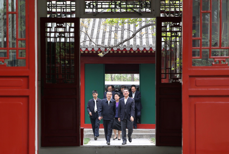 在北大國發院的“萬眾樓”前,總理與多位知名學者交流,了解大家的研究成果,并和大家合影留念。