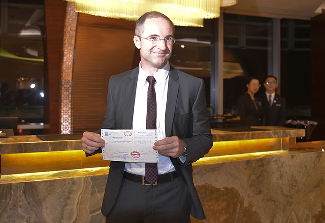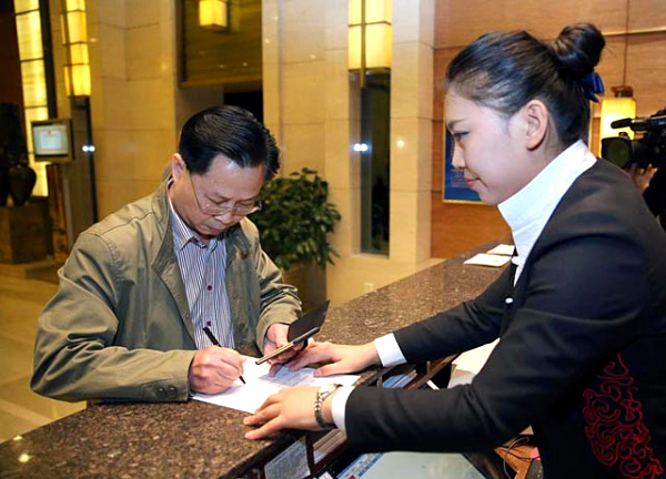 【全國首張】4月30日24時許,陳生(左)在北京民族飯店填寫增值稅發票客戶信息表。5月1日,營業稅改征增值稅改革在全國推開。當天零點一過,正在北京民族飯店結賬的溫州商人陳生接過了飯店開出的第一張增值稅專用發票,令他驚喜的是這張發票也是營改增試點全面推開后全國首張增值稅發票。