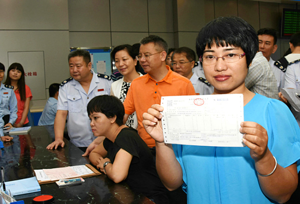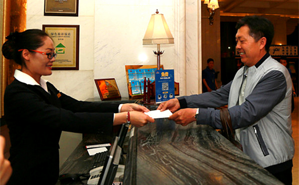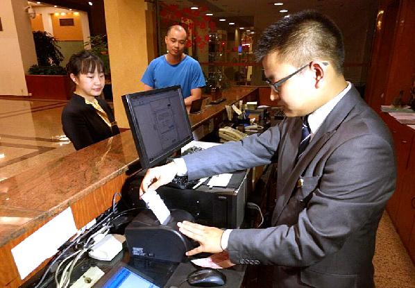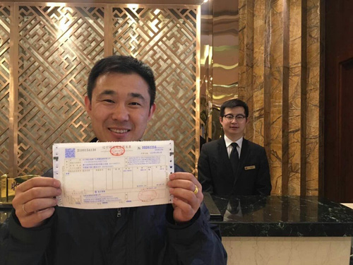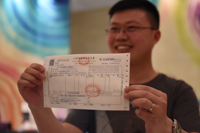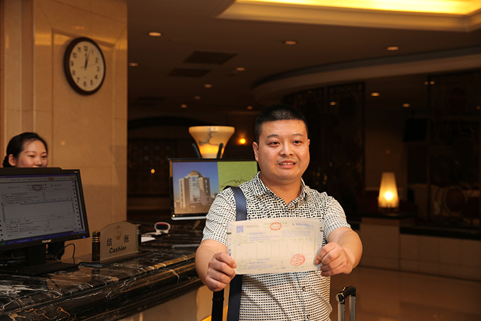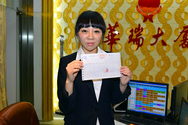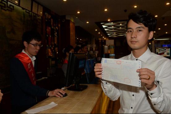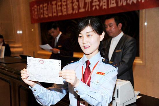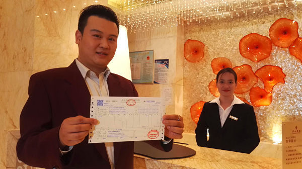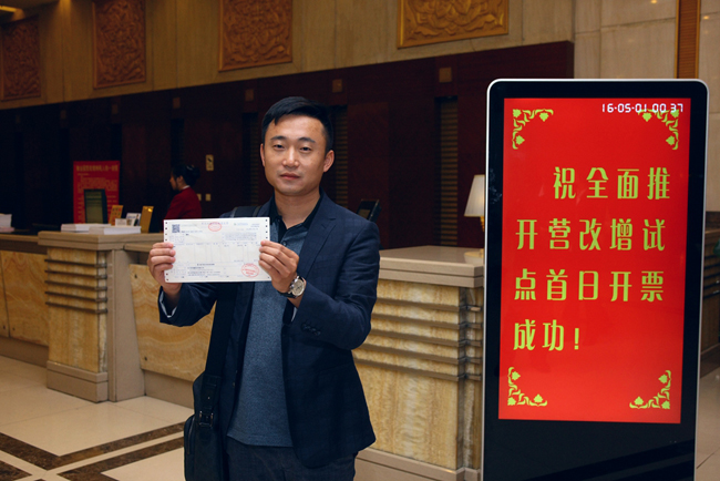 【福建】5月1日,住客謝平在展示由福州大飯店開出的營改增試點全面推開后福建省首張增值稅發票。