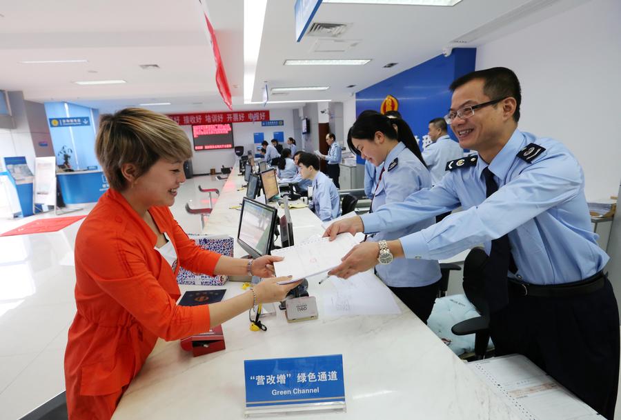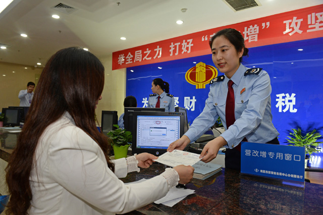 【廣西】5月1日,在廣西柳州市融安縣國稅局辦稅大廳,工作人員為納稅人辦理增值稅普通發票領用業務。當日,營業稅改征增值稅改革在全國推開。