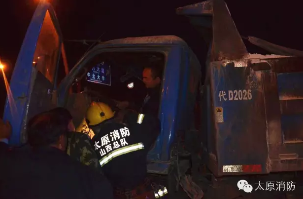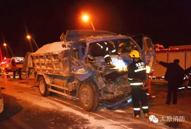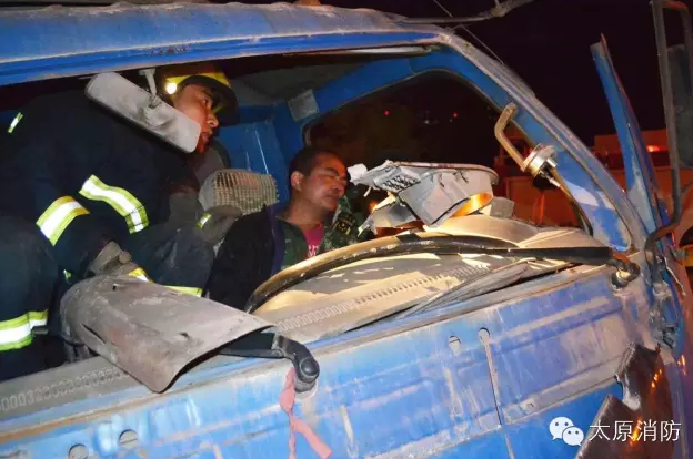 車禍的起因為一輛車逆行。事故發生后,其中一輛貨車的司機被困。 太原市公安消防支隊柴村中隊官兵迅速到達現場,當時貨車司機被困駕駛室內,意識已經開始模糊,如果不及時搶救,很可能有生命危險。指揮員立即命令警戒組兩名官兵對周圍進行現場警戒,救援組官兵利用液壓破拆工具及鐵鋌等對駕駛室車門、座位等部位進行破拆。