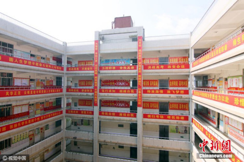 2016年3月26日,湖北省襄陽市,一所高級(jí)中學(xué)沖刺高考的正能量勵(lì)志橫幅掛滿校園。圖片來源:視覺中國(guó)