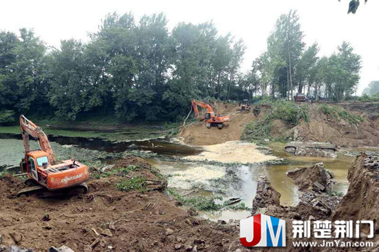 交通部門組織施工隊利用挖掘機對河水進行斷流