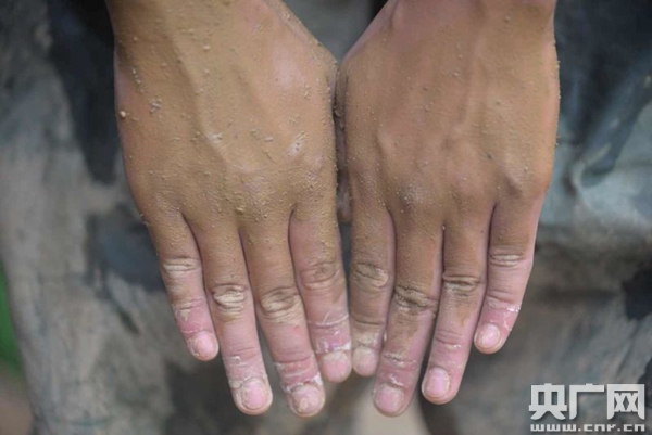 武警黃山支隊一名戰士的雙手。當時,他已連續奮戰12小時,剛剛和戰友完成打樁工作,將沙袋加高到水平面以上。