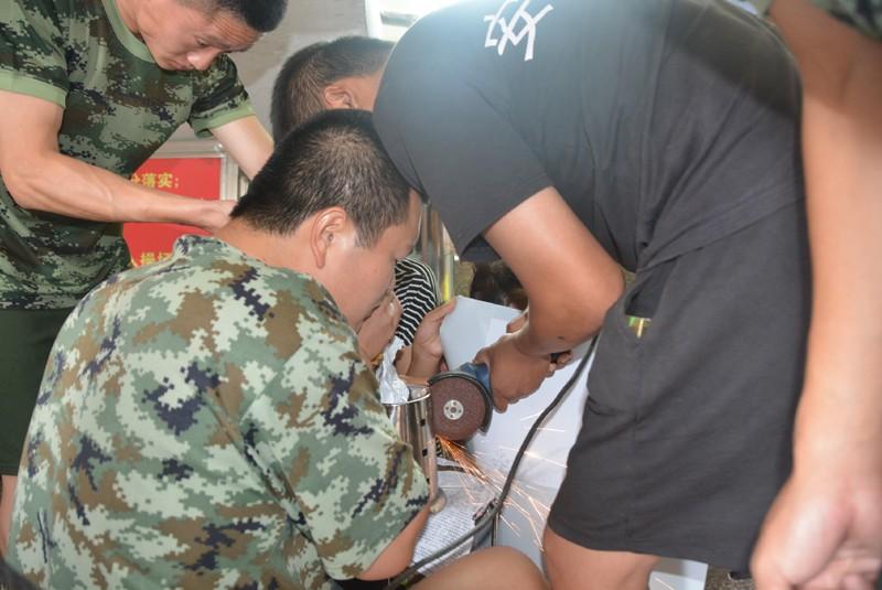 2016年7月5日,安徽蕭縣一歲男童右手拇指被卡筷簍孔洞,無法取出。為盡快將男童的手指取出,當地消防用兩把老虎鉗對筷籠固定,然后用絕緣剪對筷籠破拆。為防止破拆過程中對男童造成二次傷害及飛濺的火花驚嚇到男童,消防戰士用厚紙片對男童面部及手指進行保護,邊破拆邊噴水對切割面降溫,很快不銹鋼筷籠側面被切出一“U”型切口,10多分鐘后,男童手指被成功取出,經觀察無大礙。(王保勝 楊亞 攝)民聲供稿平臺 發