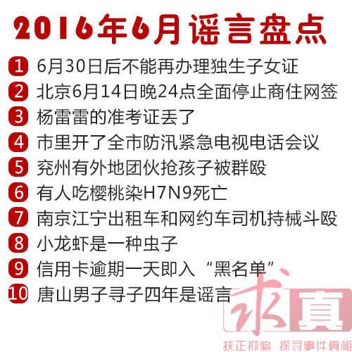 人民網北京7月18日電 (金晨)6月30日后不能再辦理獨生子女證?北京將全面停止商住房網簽?楊雷雷的準考證丟了?求真”欄目聯合人民網新媒體智庫,對6月謠言進行盤點梳理,推出“盤點6月十大謠言”榜單。