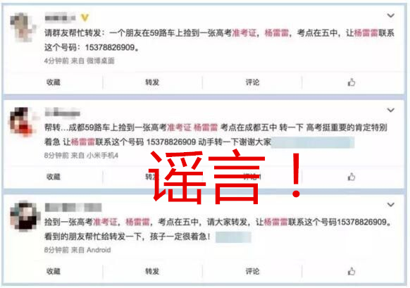 【傳聞】高考期間,一條“撿到楊雷雷的高考準考證”的消息在微博、微信上不斷被轉發。全文為:“撿到一張高考準考證,楊雷雷,考點在五中,請朋友們轉發,讓楊雷雷聯系這個號碼15378826909。一定幫他群發一下,這孩子一家肯定急死了。擴散,擴散,別耽誤孩子高考。”