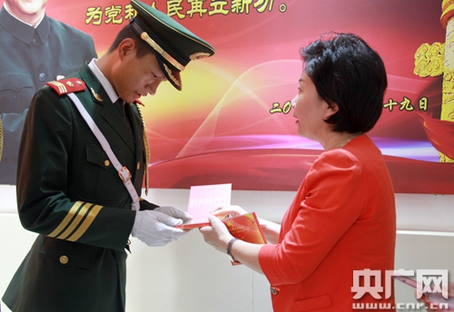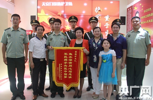 劉錦代表海南省婦聯和海南婦女群眾向國旗護衛隊官兵致以崇高的敬意和親切的慰問,并邀請曾在軍旅生涯中榮獲過四次三等功、十一次嘉獎、對部隊有著特殊情懷的王京忠先生一道向他們贈送由海南省賦蓮婦女兒童活動中心攝制、國旗護衛隊演唱的《忠誠》(又名《忠誠衛士之歌》)公益音樂片視頻光盤和“魚水深情同心寫忠誠,軍民攜手共筑中國夢”的錦旗,以表達婦女群眾與部隊官兵“同呼吸、共命運、心連心”的軍民魚水情誼。政委王建華代表國旗護衛隊全體官兵對海南省婦聯及半月談雜志社的關心和支持表示衷心感謝,并表示:“國旗是民族尊嚴的象征、是國家主權的代表,能成為國旗護衛隊的一員是我們衛隊每位官兵的榮譽與驕傲,我們定當誓死護衛,不辱黨和人民賦予我們的神圣使命。”