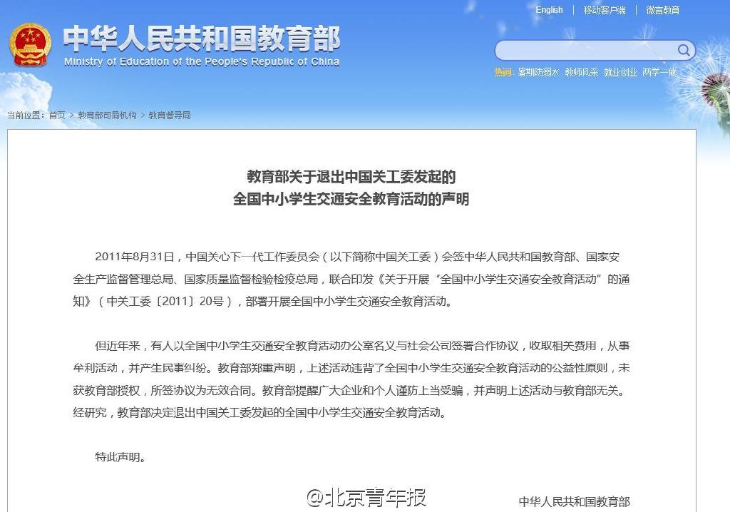 教育部的聲明寫(xiě)道,近年來(lái),有人以全國(guó)中小學(xué)生交通安全教育活動(dòng)辦公室名義與社會(huì)公司簽署合作協(xié)議,收取相關(guān)費(fèi)用,從事牟利活動(dòng),并產(chǎn)生民事糾紛。教育部鄭重聲明,上述活動(dòng)違背了全國(guó)中小學(xué)生交通安全教育活動(dòng)的公益性原則,未獲教育部授權(quán),所簽協(xié)議為無(wú)效合同。教育部提醒廣大企業(yè)和個(gè)人謹(jǐn)防上當(dāng)受騙,并聲明上述活動(dòng)與教育部無(wú)關(guān)。經(jīng)研究,教育部決定退出中國(guó)關(guān)工委發(fā)起的全國(guó)中小學(xué)生交通安全教育活動(dòng)。