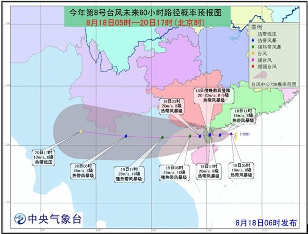 今晨,南海熱帶低壓已加強(qiáng)為今年第8號臺風(fēng)。中央氣象臺監(jiān)測顯示,今晨5時,其中心位于廣東湛江以東大約195公里的海面上,中心附近最大風(fēng)力有8級(18米/秒)。預(yù)計,將以每小時15公里左右的速度向偏西方向移動,將于18日傍晚前后登陸廣東雷州半島(20~23米/秒,8~9級,熱帶風(fēng)暴級),18日晚上移入北部灣,強(qiáng)度將進(jìn)一步加強(qiáng),最強(qiáng)可達(dá)強(qiáng)熱帶風(fēng)暴級(25~30米/秒,10~11級)。