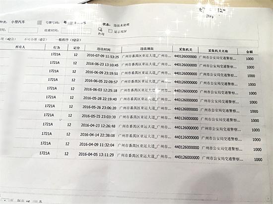 交警大隊相關負責人拿出張先生的違章記錄說:“不單是亞運大道,在廣州市區,如內環路A線工業大道出口,體育東橫街路段等地都有交通違法行為,從2014年10月1日到2016年7月15日,車主共有57宗交通違法記錄,應該說法律意識還是比較淡薄!”