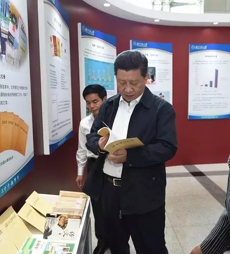 2014年9月9日,習近平在北師大考察,從展臺上拿起一本課標書翻看。新華社記者馬占成攝