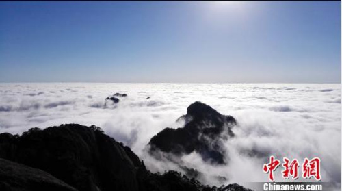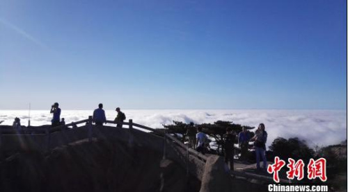 3日,黃山風景區(qū)迎來客流高峰,截至當日16時,共接待游客32829人。當日,海拔1600米以上的玉屏樓、光明頂、始信峰等地,均出現(xiàn)了浩瀚的云海。 余盛明 攝