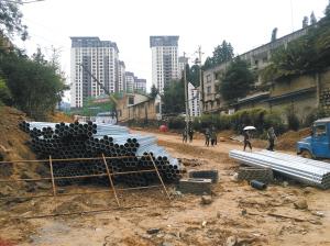 記者來到該小區,通往該小區的主干道還未鋪路,黃土路一片泥濘,鋼筋、管材堆放在一旁,小區仍在施工中。