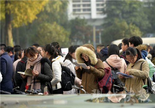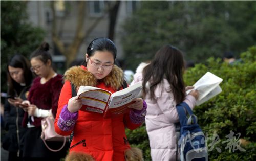 考生們進場前還要“抱下佛腳”,不過考題的知識點跨度很大。新華報業視覺中心記者 邵丹 攝 2017國家公務員招錄筆試已正式開考,昨天是國考行測和申論考試的“大日子”,共有64124名考生選擇了江蘇考區參加國考。